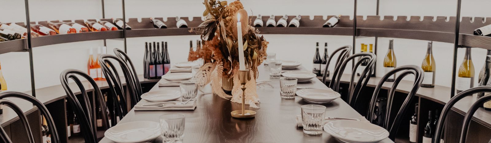 Set within an oval-shaped room, surrounded by shelves of wine, the space seats up to 14 guests around one beautifully set table.